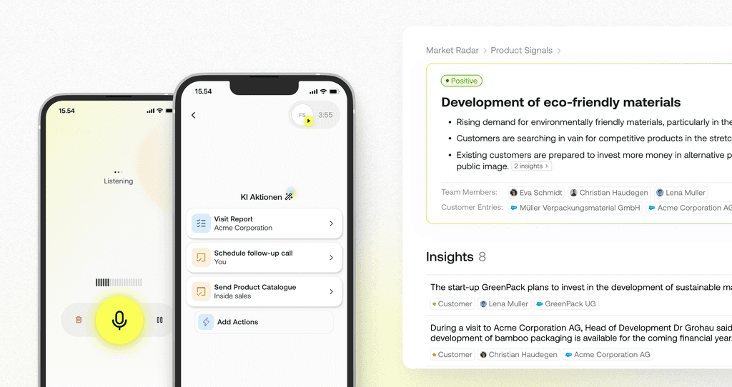 With just a press of a button on their mobile phone, salespeople can record interactions by voice and use AI to convert them into follow-up processes in the CRM in seconds. All recorded information is stored in a data lake and evaluated by AI in regular market analyses to highlight opportunities and risks for sales management.